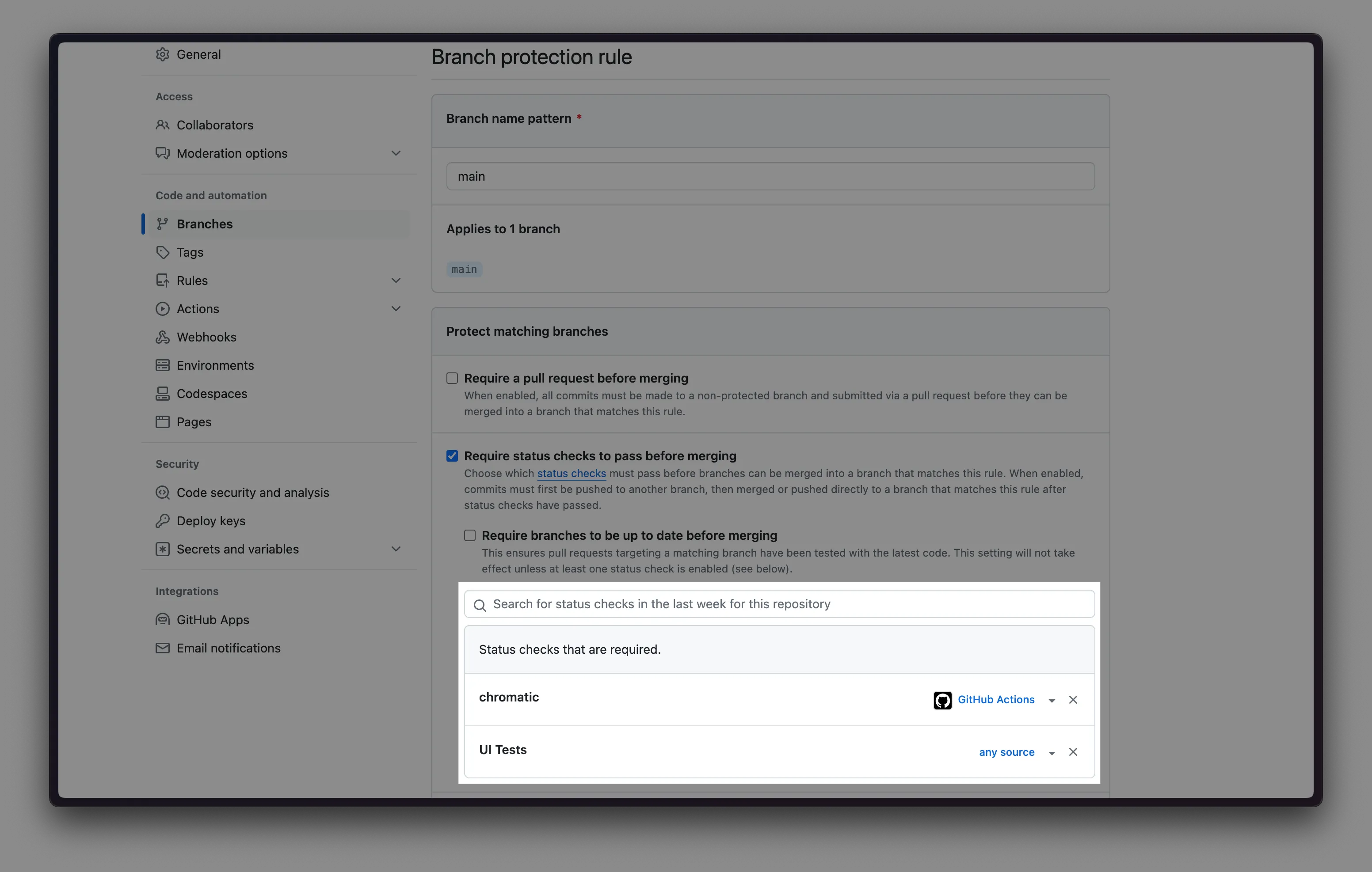 - In the search field, search for status checks (e.g.: Chromatic, UI Test, UI Review, etc.), select the checks you want to require.
